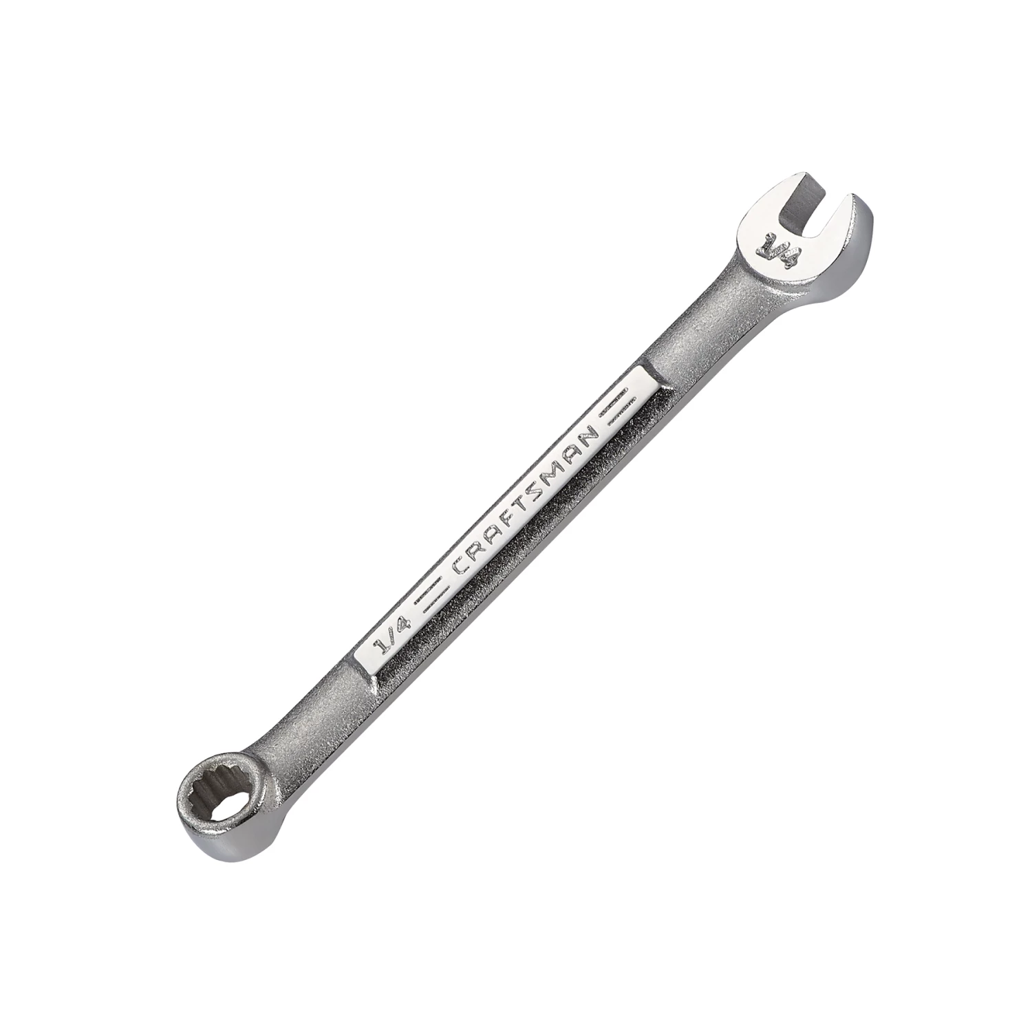 Get tough torque on stubborn fasteners with this Craftsman 1/4″ 12 point combination wrench. Forged from alloy steel for durability, this tool is heat treated, oil quenched and tempered for a uniform hardness and maximum strength. The nickel-chrome plated design resists rust and corrosion and simplifies cleaning.