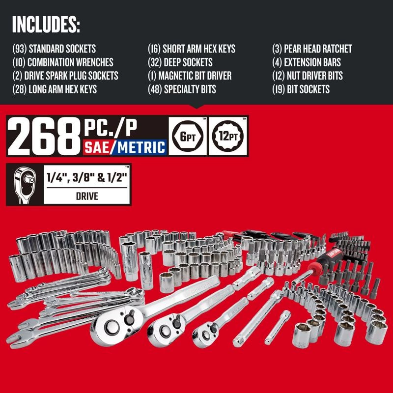 Brand Name: Craftsman , Drive Size: 1/4, 3/8 and 1/2 in. drive , Metric or SAE: Metric and SAE , Number of Points: 12 Point , Product Type: Mechanic’s Tool Set , Number in Package: 268 pc. , Material: Alloy Steel , Impact Rated: No , Finish: Polished Chrome , Packaging Type: Boxed.