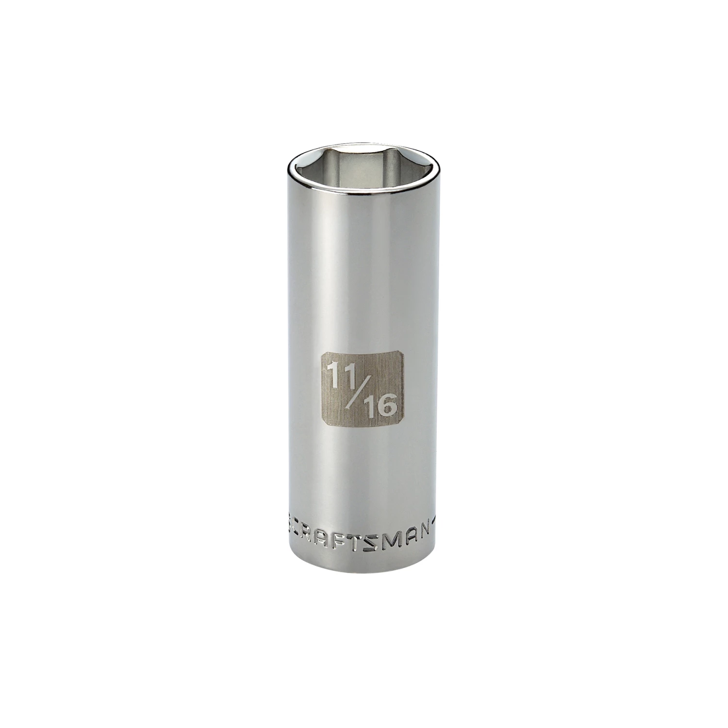 Tight nuts or bolts in cramped spaces won’t stop the job from getting done when you have the Craftsman 11/16″ x 3/8″ drive deep socket. Made from durable alloy steel, this versatile socket features 6 points of contact for a secure fit and easy turning. Large, permanent, laser-etched marking makes it easy to locate and identify, while allowing it to resist chipping, fading and corroding. The overall versatile design makes swapping between tools a snap.