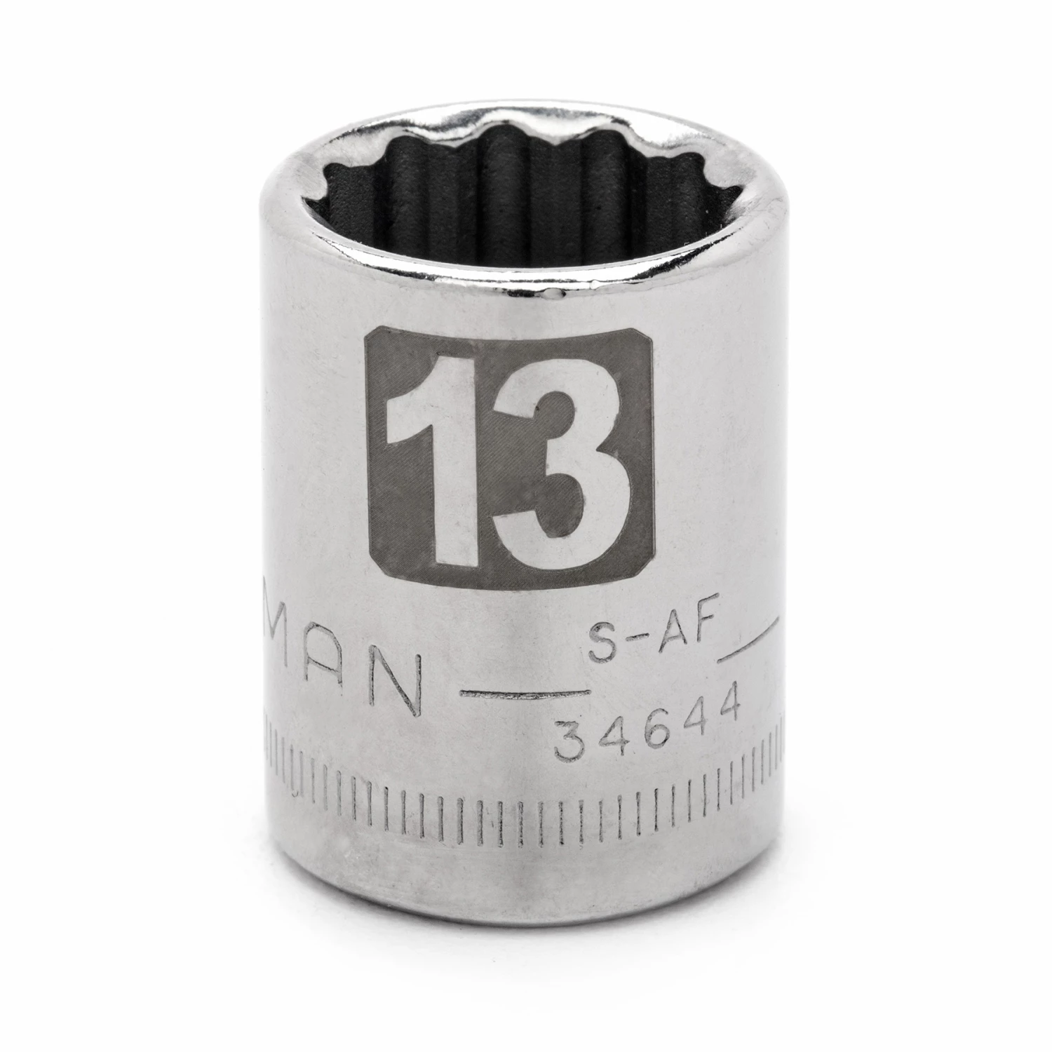Tight nuts or bolts in cramped spaces won’t stop the job from getting done when you have the Craftsman 13mm x 3/8″ drive socket. Made from durable alloy steel, this versatile socket features 12 points of contact for a secure fit and easy turning. Large, permanent, laser-etched marking makes it easy to locate and identify, while allowing it to resist chipping, fading and corroding. The overall versatile design makes swapping between tools a snap.