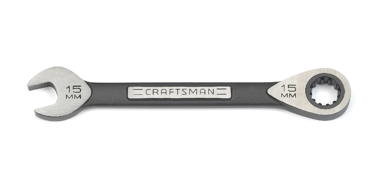 This Craftsman 15mm universal ratcheting wrench features a universal tooth design with ratcheting action to grip six various types of fasteners for a tool you can depend on. An angled head provides better knuckle clearance and leverage, while the thicker, rounded beam ensures comfort in hand and strength. The reinforced open end reduces tip spread under heavy load and prevents rounding.