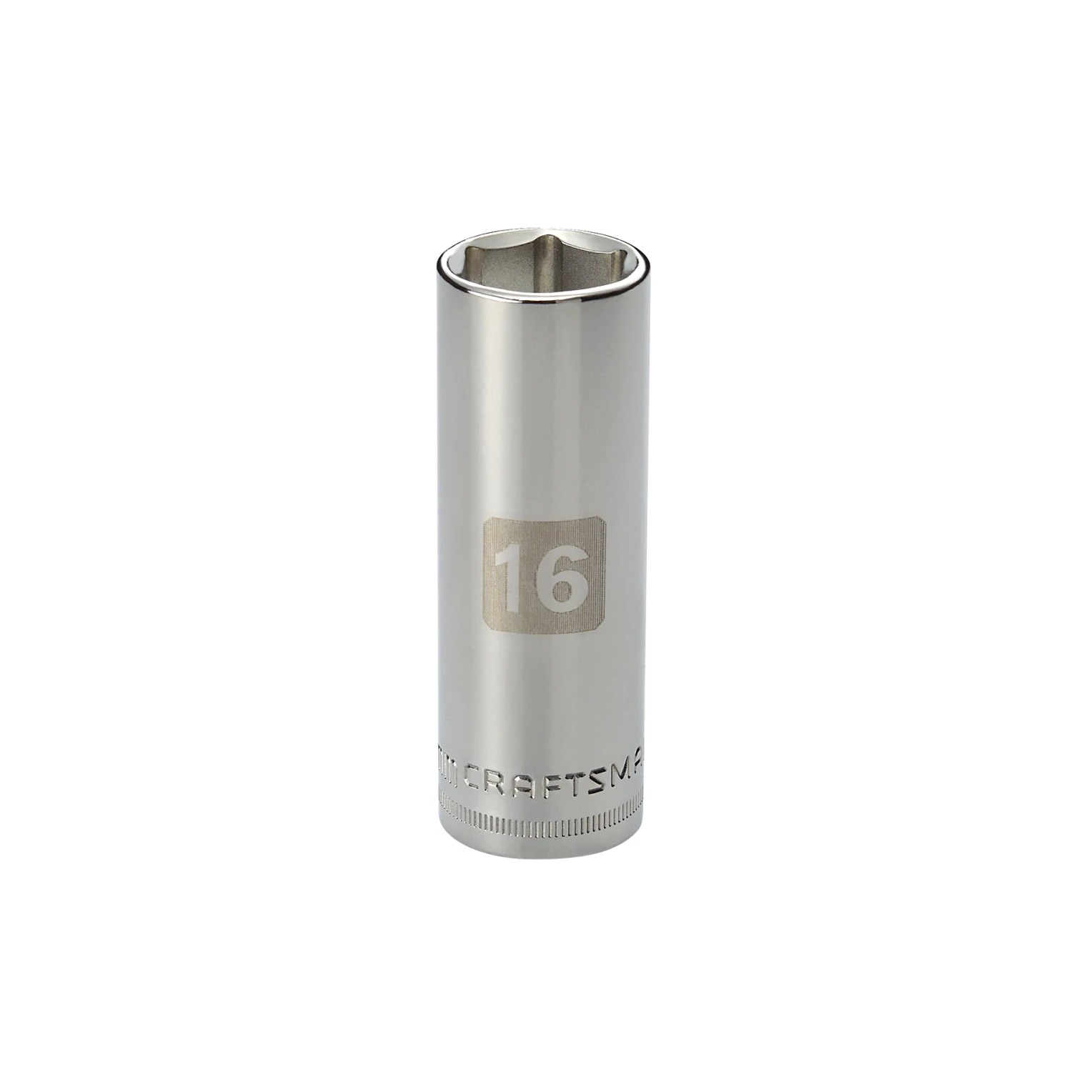 The Craftsman 16mm 3/8″ drive deep socket is great for turning nuts onto bolts when the bolt extends upward into the socket or when you need a little extra reach when tightening or loosening a stubborn nut or bolt. This deep socket is made with easy-to-read markings that increase visibility even in low light. Alloy steel construction ensures long-lasting, reliable use.