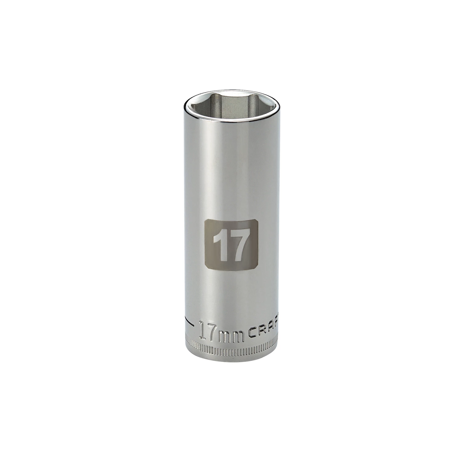 Grab the Craftsman 17mm 3/8″ drive easy-to-read deep socket for work on the bench or under the hood. The deep design gives you a little extra room when tightening or loosening a stubborn nut or bolt. Easy-to-read markings increase visibility even in low light. Durable allow steel resists fading and corrosion.