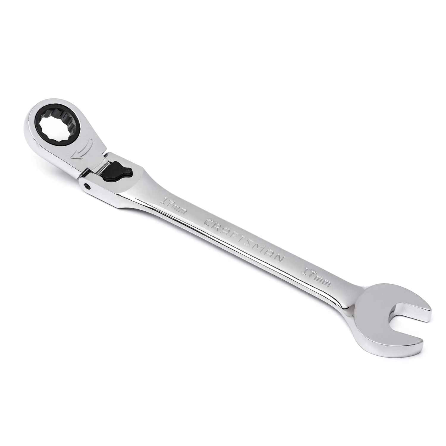 Get the job done right with this Craftsman 17mm locking flex ratcheting combination wrench. Crafted from alloy steel, this tool is built to last and wipes clean easily. The tight grip channels every ounce of torque into the fastener and ensures never-slip use to lessen damage. A pivoting head works at 180 different angles with 11 locking positions, making work in tight or