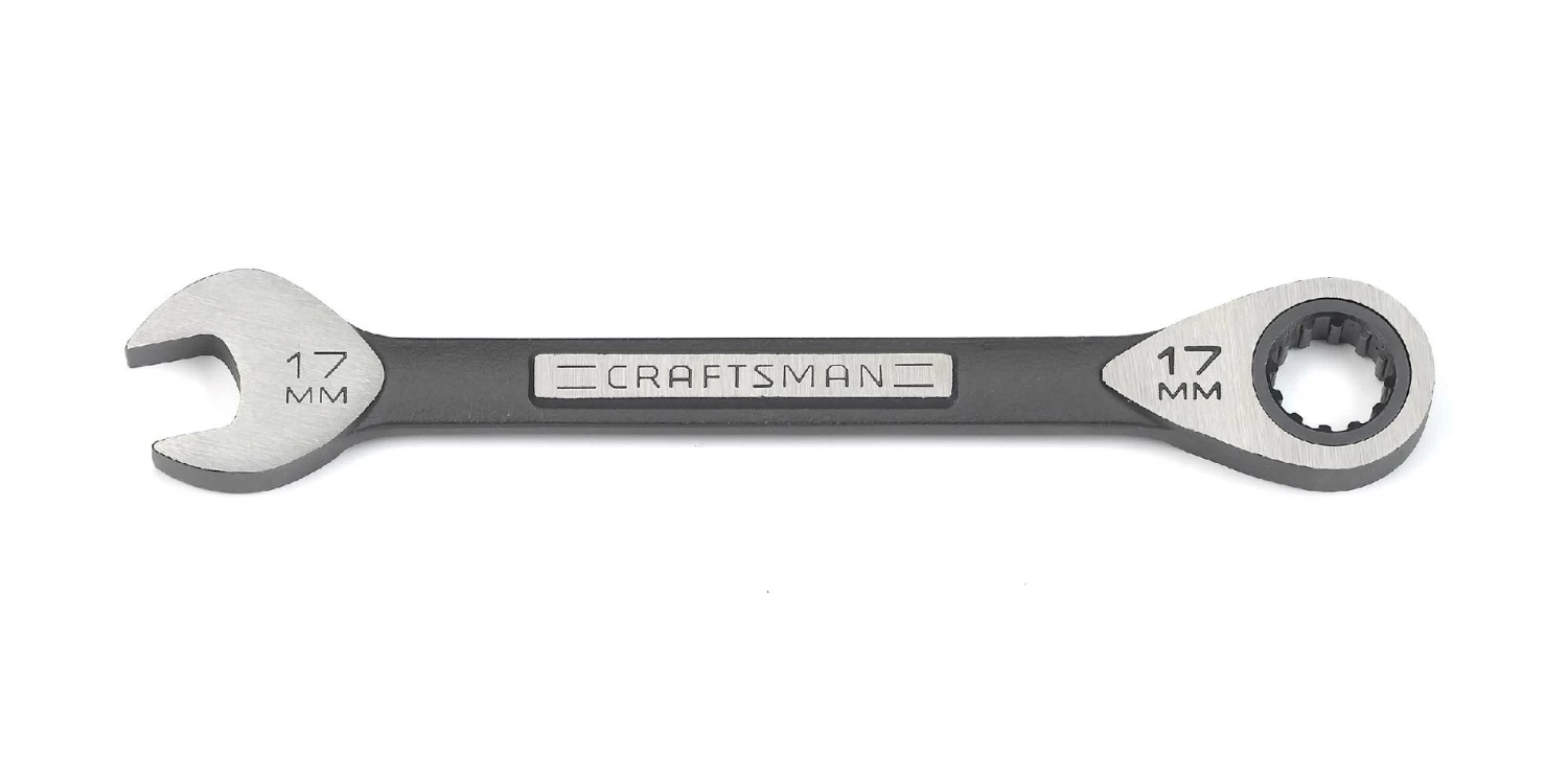 The Craftsman 17mm Universal Ratcheting Combination Wrench grips six different types of nuts and bolts: Spline, Hex (6pt), 12pt, square (4pt), external Torx and partially rounded hex (6pt). The angled head provides knuckle clearance and better leverage, while a thicker, rounded beam ensures comfort and strength. Reinforced open end reduces tip spread under heavy load, preventing rounded fasteners. High contract marking makes size identification easy. Matte finish for non-slip grip.