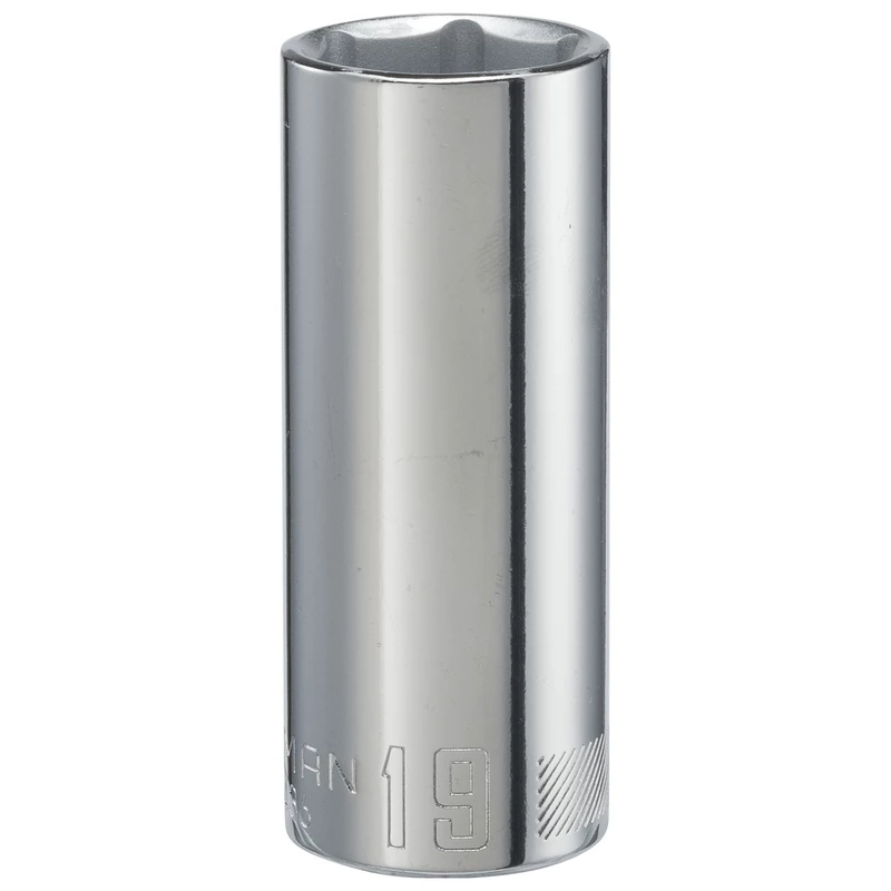 Brand Name: Craftsman , Socket Size: 19 mm , Drive Size: 3/8 in. drive , Metric or SAE: Metric , Number of Points: 6 Point , Product Type: Deep Socket , Number in Package: 1 pc. , Finish: Polished Chrome , Material: Alloy Steel , Packaging Type: Carded , Impact Rated: No.