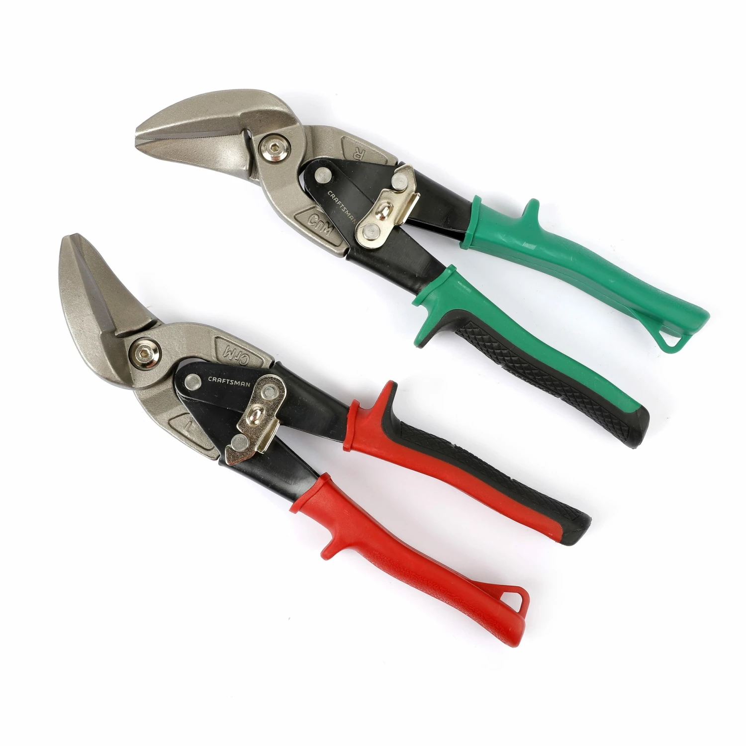 2-piece offset aviation snip set, cuts Pinch-thru-point, requiring fewer rebites and accurate trim cuts. Offset blades channel sharp material edges away from users hand allowing for easier long cuts. blade pivot bolt is threaded into bottom blade keeping blades in adjustment for ease of operation. Makes both left and right cuts thru thick material. Bottom blades are serrated in order to grip material during cut.