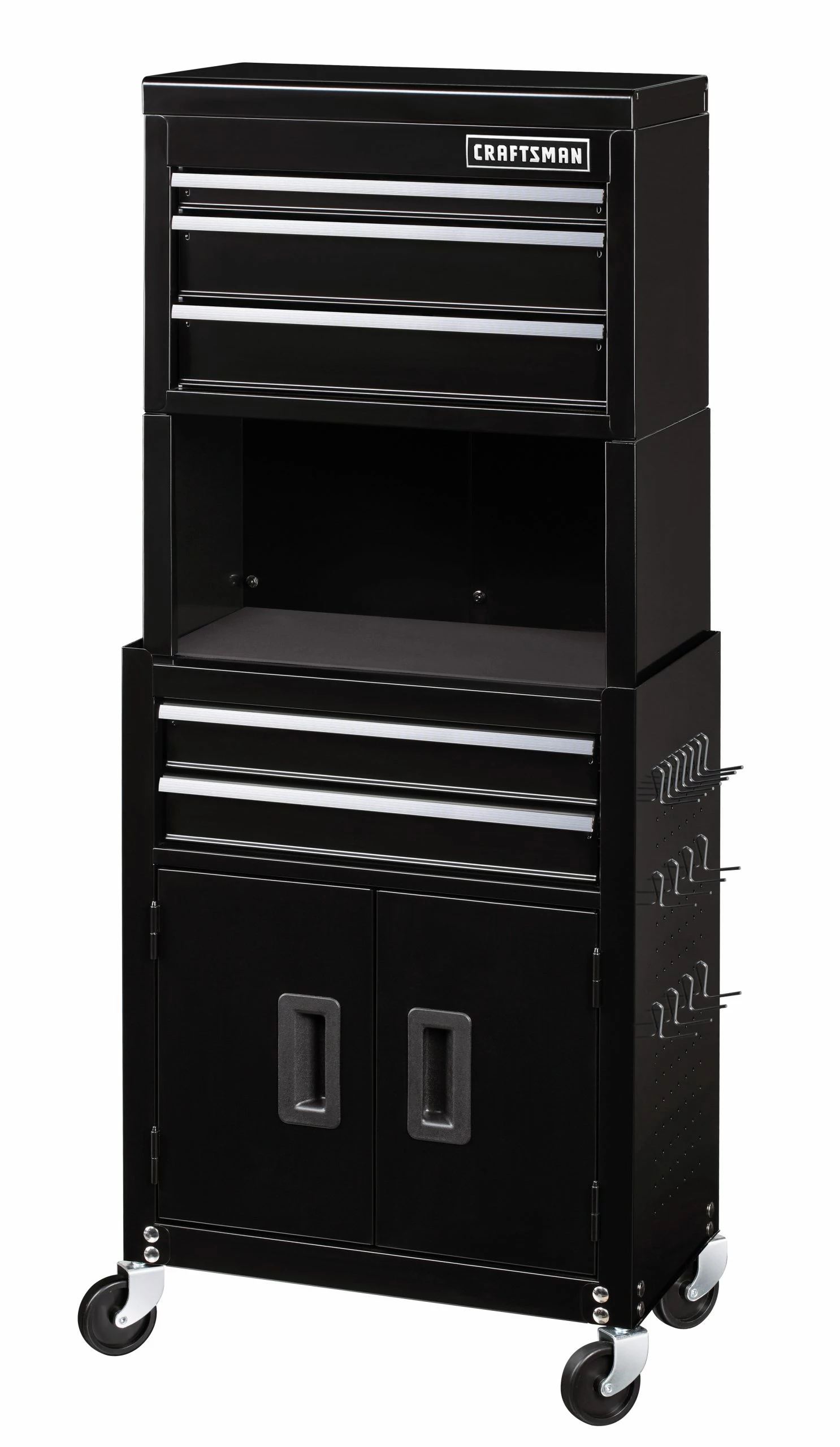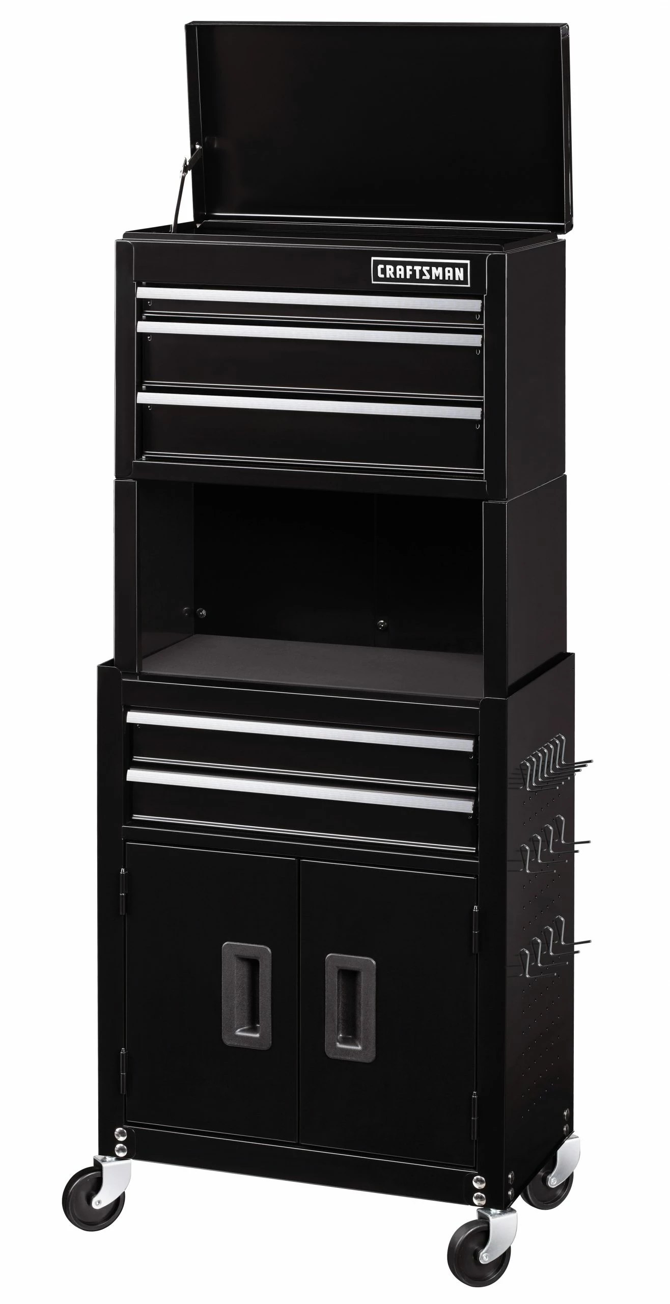 The Craftsman 20 in. 5-Drawer Tool Chest and Cabinet Combo with Riser will provide you with many different storage options. The top chest has 3 drawers and a top tray. The lower section has two additional drawers and a 2-door bulk storage area. There is a 9.5 in. tall riser between the two sections that creates an additional storage space. All drawers are equipped with ball-bearing drawer slides, so they glide open and close smoothly as well as pre-cut liners. The sides of the lower section have pegboard holes in them to create even more storage options. 15 peg hooks are included with the unit. The entire combo can be moved to wherever it is needed in your workspace on 4 swivel casters.
