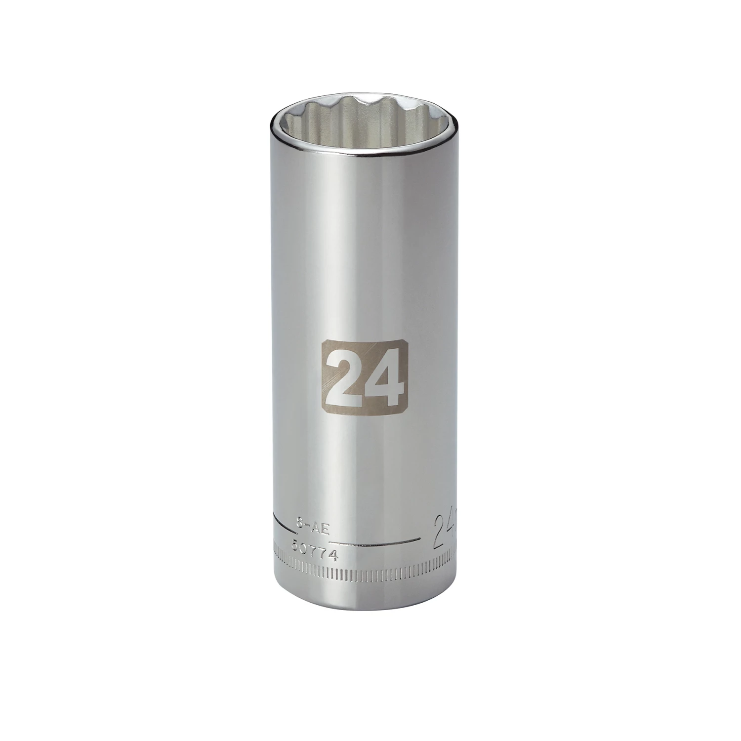 Grab the Craftsman 24mm 1/2″ drive easy-to-read deep socket for work on the bench or under the hood. The deep design gives you a little extra room when tightening or loosening a stubborn nut or bolt. Easy-to-read markings increase visibility even in low light. Durable alloy steel resists fading and corrosion.