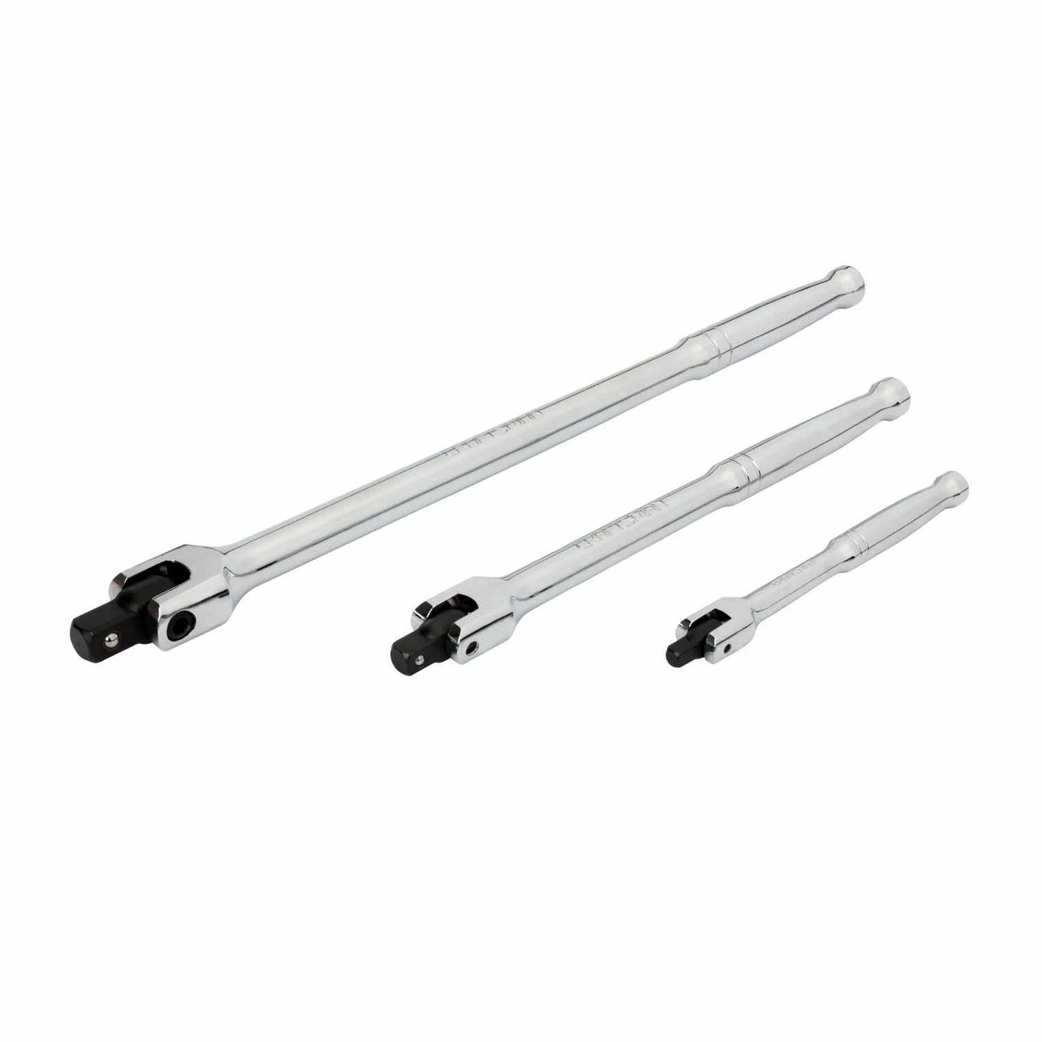 - Set includes 6″ 1/4” drive flex T handle, 10″ 3/8” drive flex T handle and 15″ 1/2” drive flex T handle
