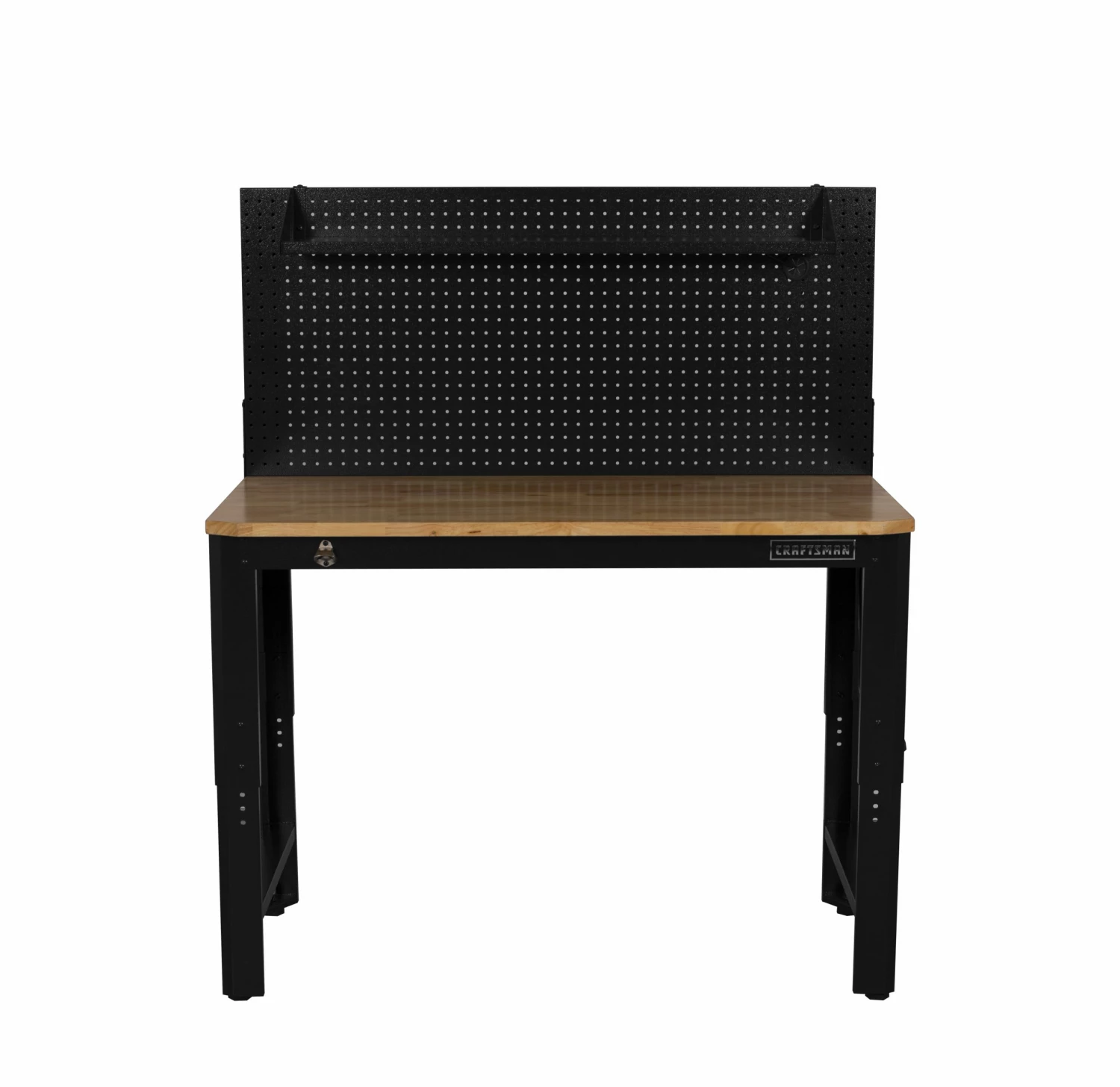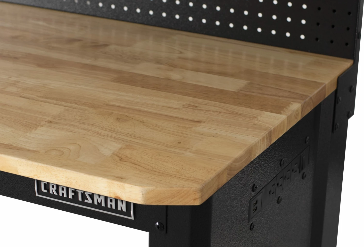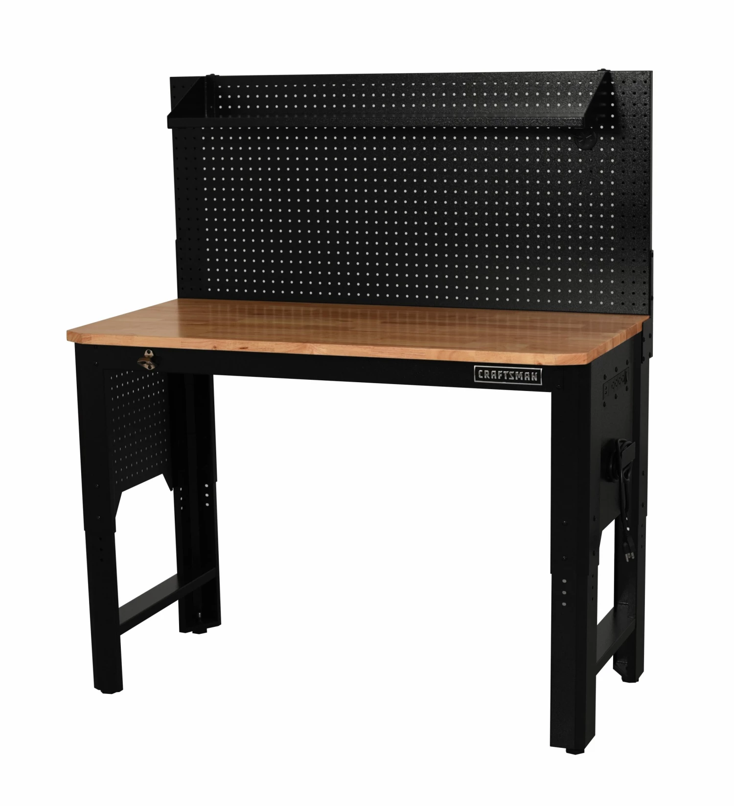 The Craftsman 48 in. Adjustable Height Workbench with Pegboard and LED Light would provide a great place to work on projects in your garage or other workspace. The legs are adjustable to create a worktable height between 32-44 in. The workbench has a 1 in. thick solid wood top that creates a 1,152 sq. in. work surface. Attached to the rear of the workbench is a pegboard that can be used to organize and allows quick access to any tool or supply. There is also a long shelf that provides additional storage space. Underneath the shelf is a magnetic LED light that can be used to illuminate your workspace. Finally, there is an integrated power strip with 6 outlets and 2 USB ports that can power any tool or electronic device. Combine this workbench with other Craftsman garage storage items (sold separately) to create your optimal storage solution.
