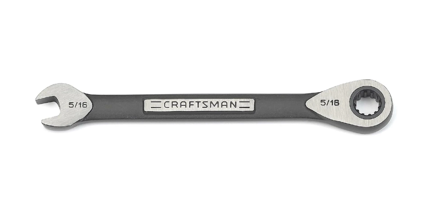 The Craftsman 5/16″ Universal Ratcheting Combination Wrench grips six different types of nuts and bolts: Spline, Hex (6pt), 12pt, square (4pt), external Torx and partially rounded hex (6pt). The angled head provides knuckle clearance and better leverage, while a thicker, rounded beam ensures comfort and strength. Reinforced open end reduces tip spread under heavy load, preventing rounded fasteners. High contract marking makes size identification easy. Matte finish for non-slip grip.