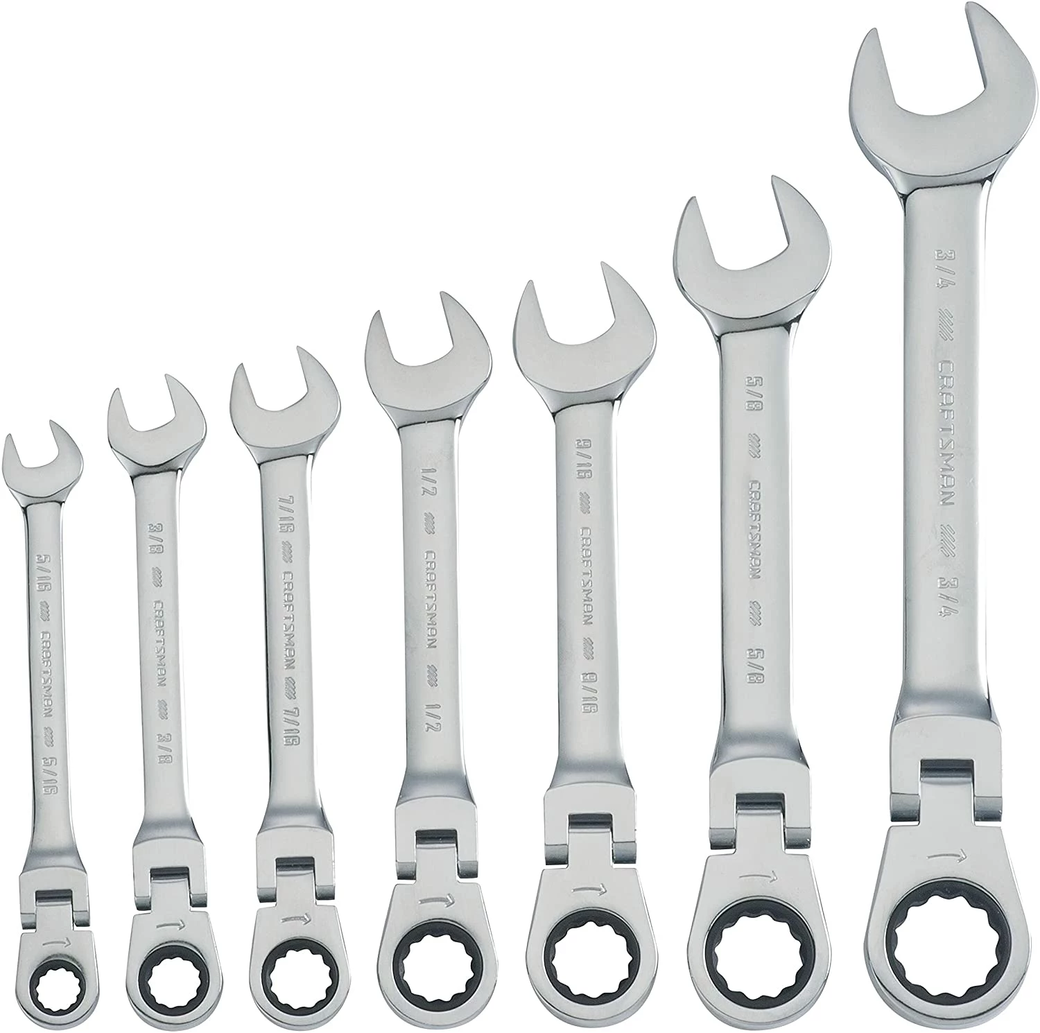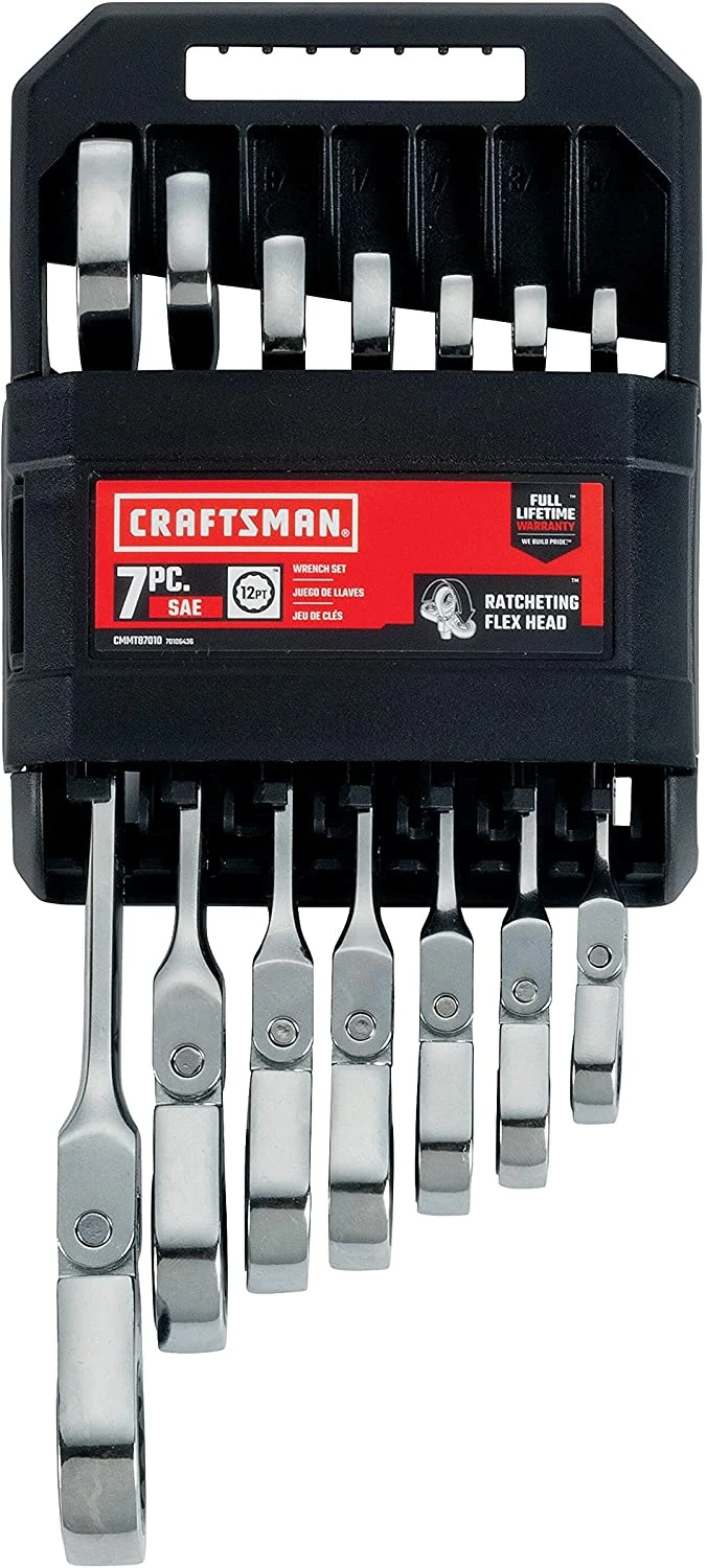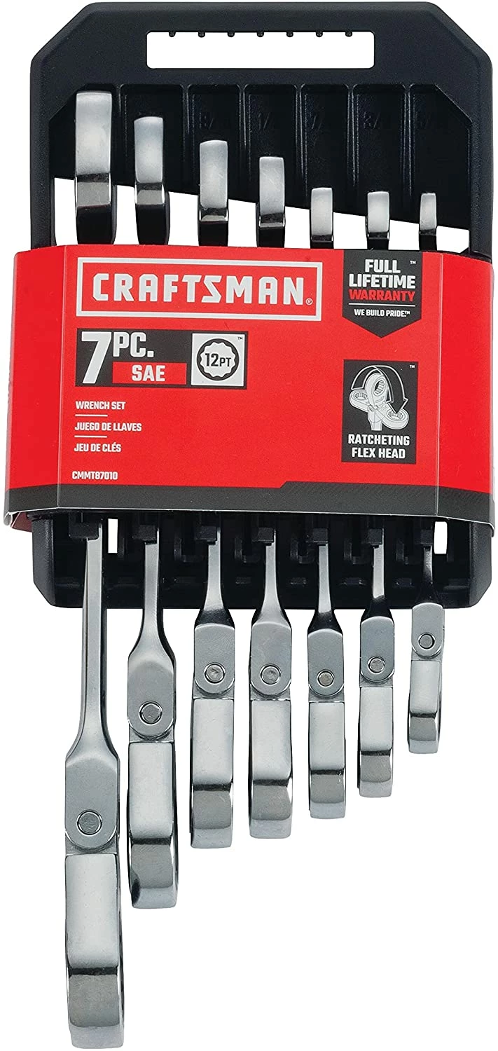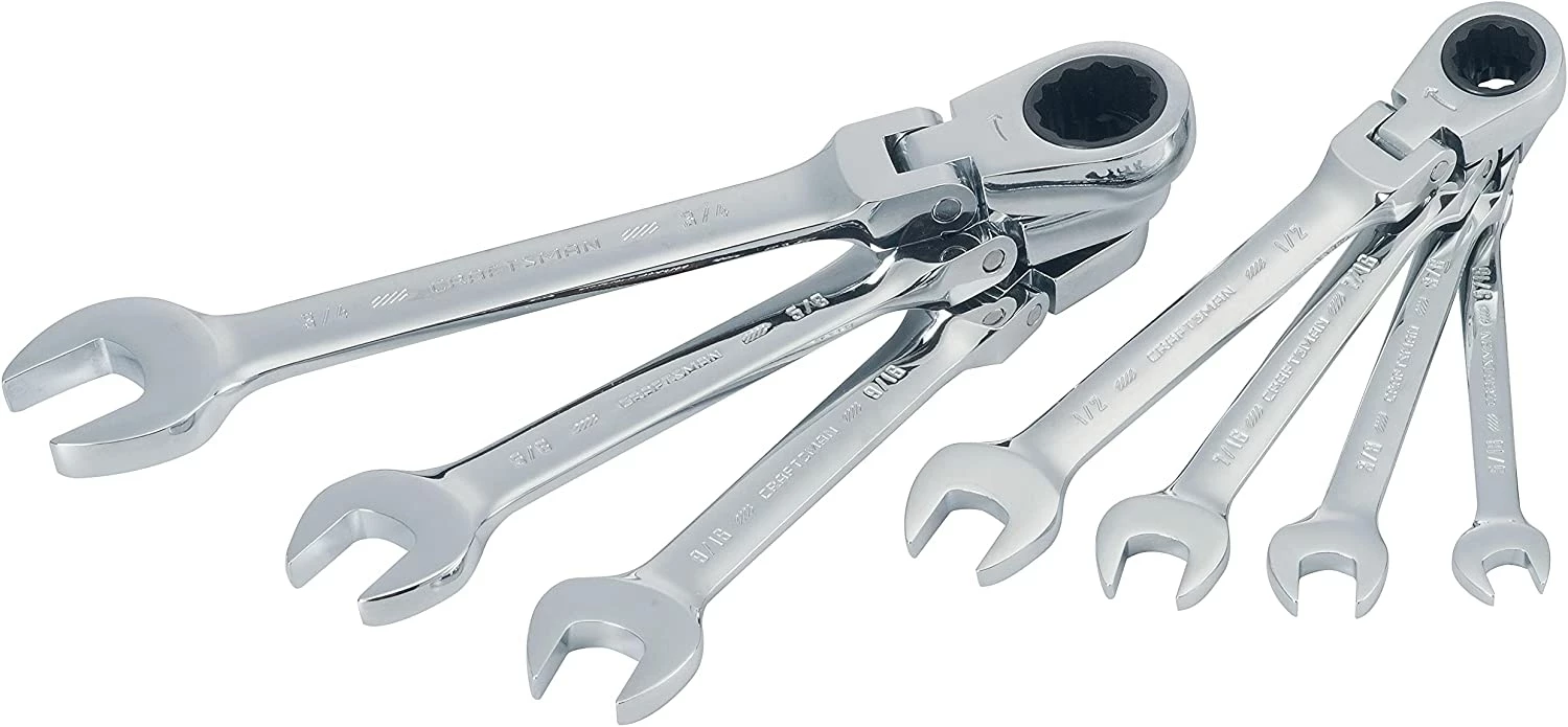 The CRAFTSMAN® 7-piece Standard (SAE) Flex head Ratcheting Wrench Set provides a versatile box end design. The Ratcheting head can flex 180 degree, which provides greater accessibility.