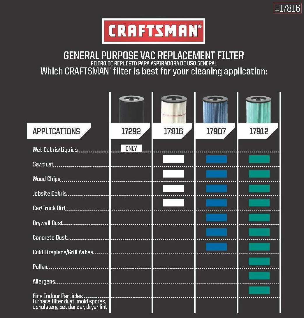 The Craftsman general purpose Red Stripe vacuum cartridge filter is an efficient part of your ongoing battle against everyday dirt like sawdust, wood chips, job site debris and car or truck dirt. With up to 10 times the surface area of standard foam filters, it tackles cleanup jobs like a pro. Fully assembled and ready for use, it offers exceptional compatibility with most shop vacs produced since 1988.