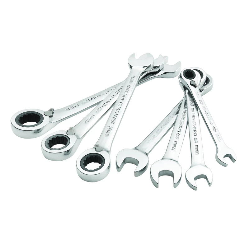 Brand Name: Craftsman , Metric or SAE: Metric , Style: Reversible , Product Type: Ratcheting Combination Wrench Set , Number in Package: 7 pc. , Material: Alloy Steel , Ratcheting: Yes , Finish: Polished Chrome , Packaging Type: Carded.
