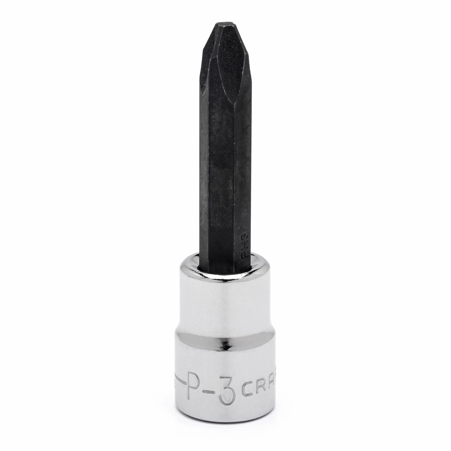 Ratchet up your screwdriver with the Craftsman No. 3 Phillips bit socket. This socket allows you to bring the convenience of ratcheting to Phillips head screws. At 2-3/4″ long, you can bypass obstructions without losing torque, allowing you to secure and bust loose stubborn screws with ease and efficiency. This bit socket combines the convenience of a socket wrench with the strength of a screwdriver.