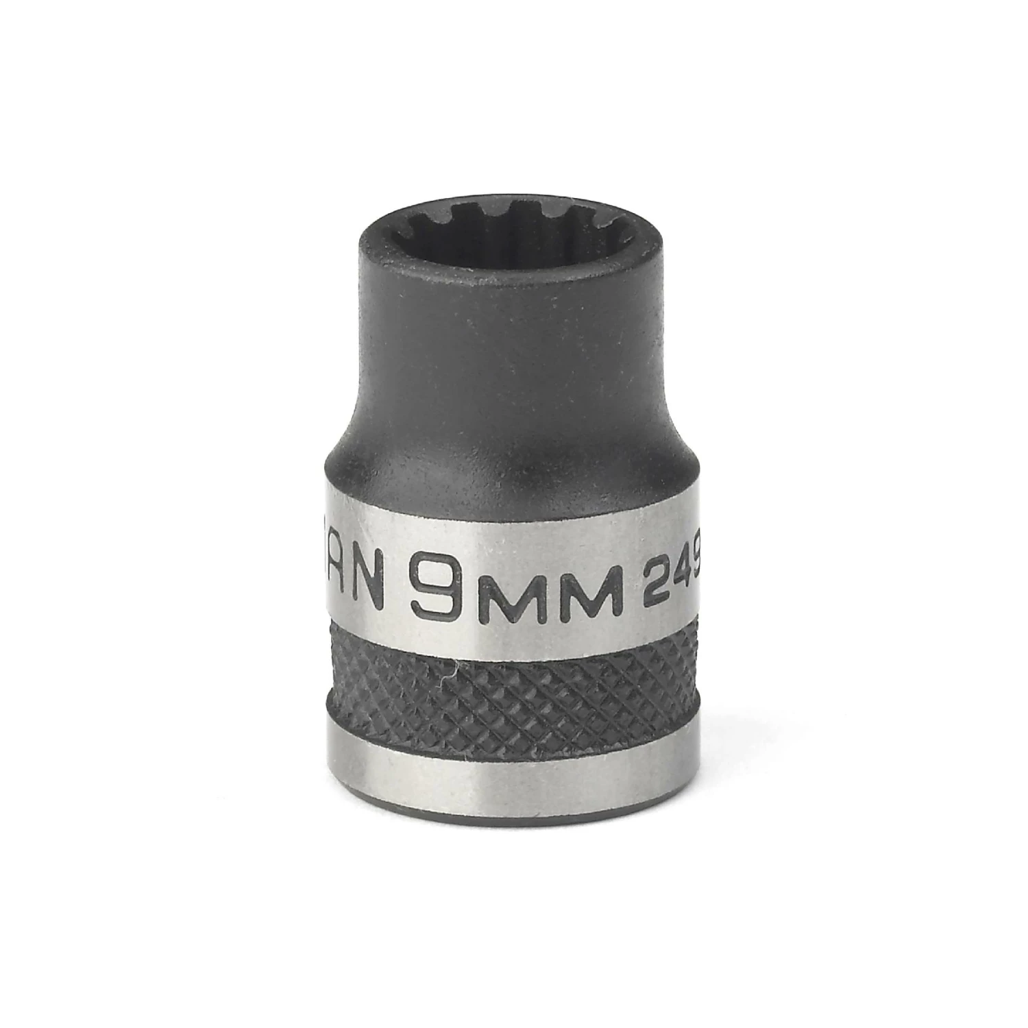 This 9mm Universal socket can fit six different fasteners on the box end — 6 point, 12 point, 4 point, external torx, spline, and even partially rounded hex fasteners! High Contrast Marking makes size identification easy, saving you time. Matte Surface Finish on the knurling provides non-slip grip for excellent control. 3/8 in. drive.