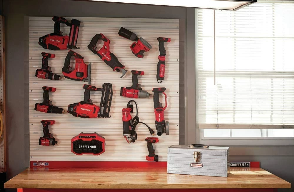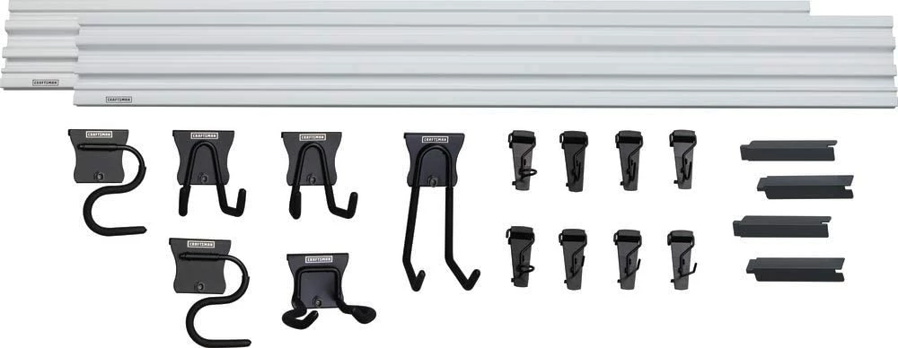 There’ll a place for everything in your garage with the CRAFTSMAN versatrack track wall system. Versatrack rails mount to drywall, studs or masonry and can hold up to 75 lbs. Per linear foot. CRAFTSMAN hooks securely latch to the rails with the patented hooktite latching system. The kit includes a variety of hooks to hang hand and power tools, landscaping equipment, ladders, sporting equipment, and more.